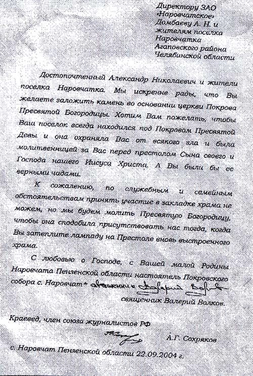 И теперь она является достоверным свидетельством истории Божиего дома. Большое участие в его судьбе приняли протоиерей Никольского храма г. Магнитогорска Федор Сапрыкин, настоятель храма Владимирской иконы Божией Матери Сергей Резепов, не остались в стороне от развивающихся событий тогдашние глава района Александр Давлетбаев, глава Наровчатской сельской администрации Анвар Кашапов и другие.